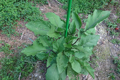 8月上旬。日照りで枯れそうでしたが持ちこたえました。お花がついています。縛り直し。