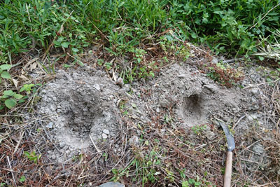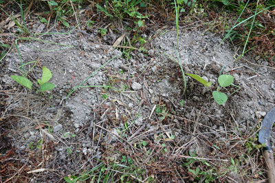 穴を掘って水を入れて植え替え。でも移動後もいまいちで育たず。場所は菜の花跡地。この場所がいまいちなのかも。