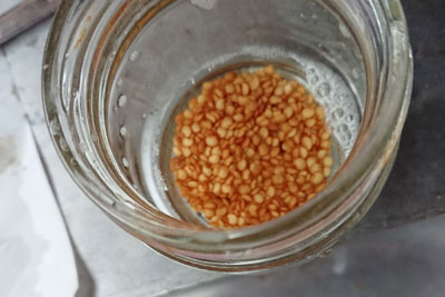 ガラス瓶に入れて果肉を洗いました。水に浮いた種は取り除いて、沈んだ種だけにしました。