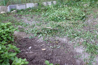のこぎり鎌を使って、穴部分の草を取り除いて、土をほぐしました。