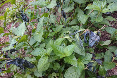 はじめは枯れた部分を取って干していたのですが、取ったほうが元気な葉に被害が広がる感じがしたので、放置。