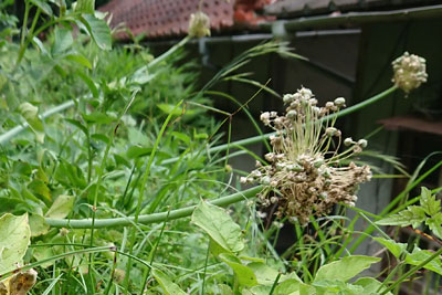 7月初旬、ネギ坊主が茶色くなってきました。