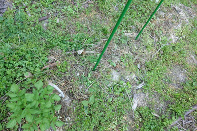 6月上旬、支柱に麻紐で縛りつけ、草マルチ。