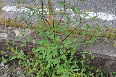 センダングサ属の雑草は、種になると、服にひっつくやつです。まだお花の時期です。今回はスーパー脇の道端のアスファルトで前日に採取しました。