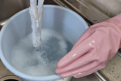 焼きみょうばんで媒染液を作って、アルミ媒染しているところ。発色が変化します。