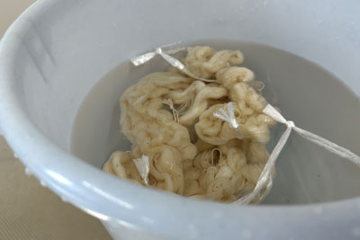 濃く染めるため染液を工夫して、糸がオレンジがかった色になったところ。でも染めたかった黄色とは違ったので、あとでリカバリしました。戻ってよかったです。