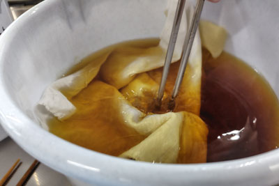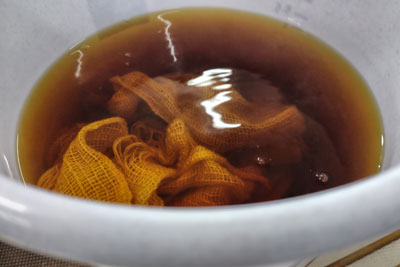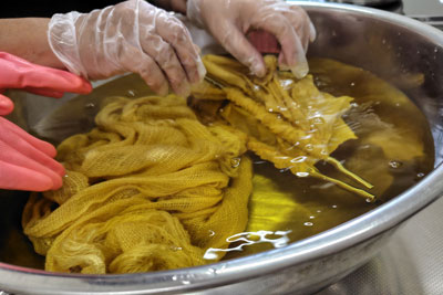黄金色の染液がとれて、染め始めたところ。これは木綿の布。