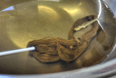 もう一度染液に戻して染めて、辛子色っぽい雰囲気に。経糸と横糸で素材が違って、色の入りも違います。