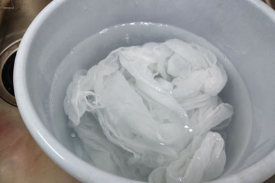 布の前処理の準備。バケツをくるくるローテーション移動して、初めて会った方同士とは思えない連携作業でした!