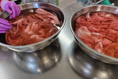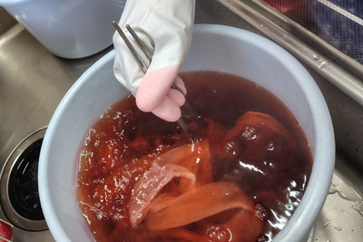 染め途中段階。少しずつ違う色に染まっています。