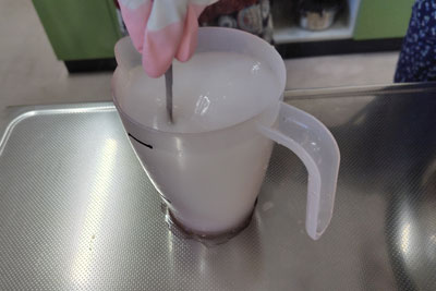 草木染めでは媒染という作業をして色をつけるのですが、媒染用のみょうばんを溶かしているところ。