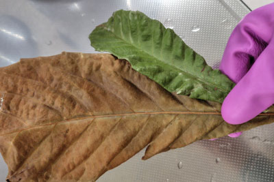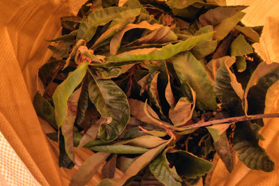 今回使ったビワの葉は、岡山県備前市の和菓子KOUさんのお店の庭にある枇杷の木を剪定したもの。切った枝葉を11月末にゆずってもらい、乾燥葉として保管しました。