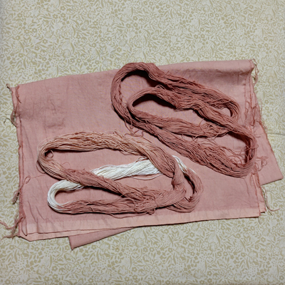 綿糸と刺繍入り布。優しい可愛い色、染めた時より少し薄いピンク、とのことです。