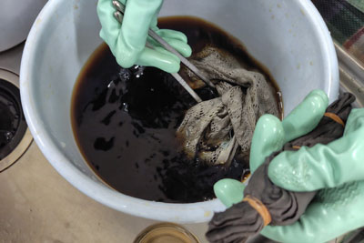 その後、媒染しているところ。今回は鉄媒染。暗い色に発色します。