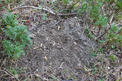 藍畑予定地は、夏は緑肥(土浄化用)のヒマワリとソルゴーを育てていた場所。地面をコンポスト代わりにしていて、台所で出た野菜や果物のクズを埋めているので、その栄養が入っています。