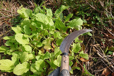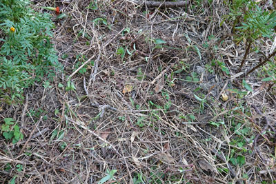 11月下旬、マリーゴールド脇。サイズ比較としてノコギリ鎌といっしょに撮影。