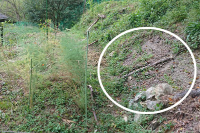 あと、家庭菜園にした場所は、元々笹の根がはびこっていて、斜面の近くは土砂崩れ防止に残しています。家庭菜園開墾時に、笹の根を取り除きすぎて斜面が崩れたので。