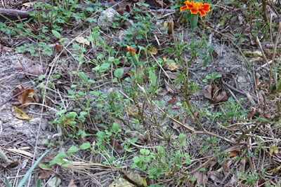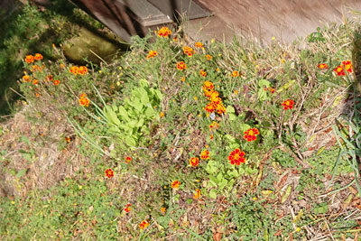 11月中旬、マリーゴールド脇。やっと引きの写真発見。黄緑色なのが菜の花。秋冬のほうが日当たりがよい場所です。