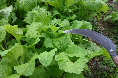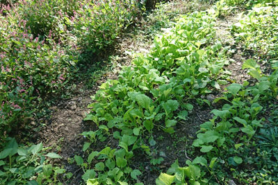 同じ日、1月上旬、藍畑予定地の菜の花は大きいです。冬は緑が少ないので、明るい雰囲気になります。