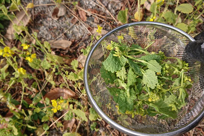 1月上旬、家庭菜園のとても小さい菜の花のつぼみを初収穫しました。普通は近くの茎と葉でかさ増しになるのだけど、葉っぱがすごく小さいです。一食分もないような。