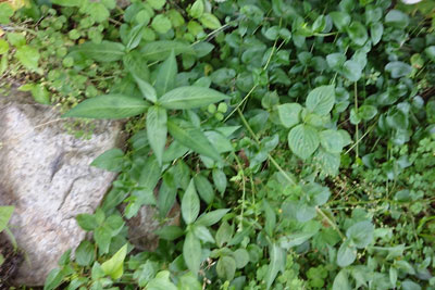 6月中旬のイヌタデ。石の右上、細長い葉っぱがイヌタデです。