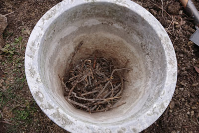 プラスチック植木鉢(残留物)の底に、笹の根を敷きました。白い菌糸がついていて発酵に役立ちそうなので。草刈りして放置してたもの。