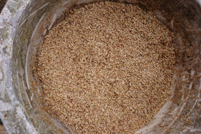 もみ殻を入れて、米ぬか+水。握ると固まるくらいの水分量。上の方は籾殻でカバー。
