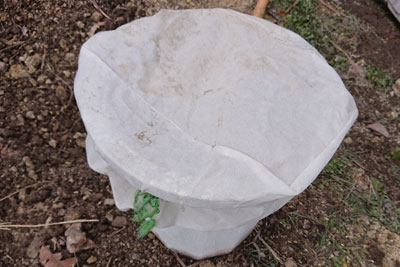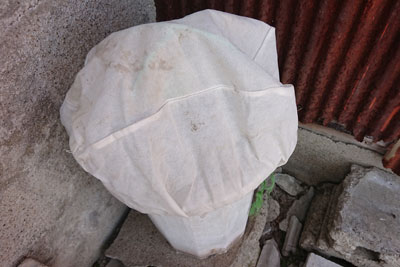 不織布を植木鉢に被せて、紐で留めました。