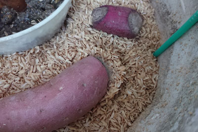 温床に設置。台所にあった食用のサツマイモで傷みかけたものもついでに籾殻の上に置きました。