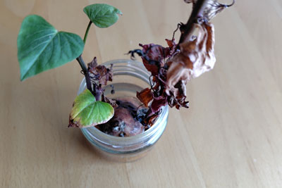 苗の元1つは室内で水耕栽培していたもの。冬に食べたサツマイモで、芽が出た芋があったので、切れ端をガラス瓶で育てました。たぶん、紅あずまだと思います。